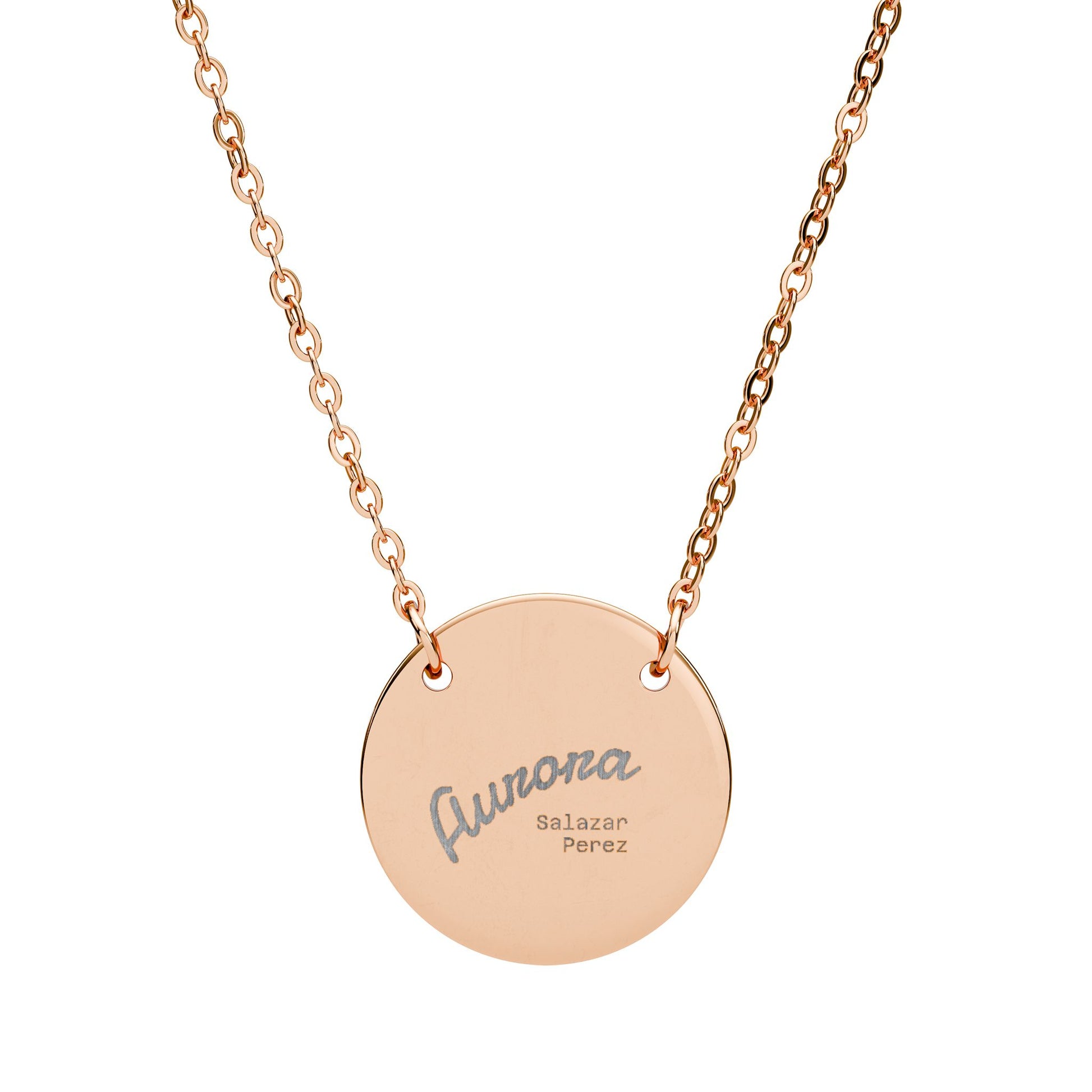 A small, engraved circle necklace that feels quietly personal. The slim round pendant carries a crisp laser-etched name or message across a polished surface, hanging from a delicate chain with a secure lobster clasp. Lightweight and low-profile, it slips under a collarbone or layers easily with other pieces. The surgical-grade stainless steel keeps the finish bright and resists tarnish while the hypoallergenic construction means it can be worn every day without irritation. Choose polished silver or a bold black PVD finish for a subtle statement that reads as intentional and familiar.